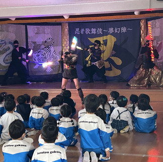 そして今回は恒例の保護者会(厚生部)さんのご担当で手配していただいた出し物でしたが、今回は「忍者歌舞伎~夢幻陣~」の"忍者ショー"でしたが、楽しく愉快なショーで2部ともみんな最後まで大盛り上がりで楽しい時間を過ごすことが出来ました。最後には手裏剣投げ体験をして楽しそうでしたよ!!