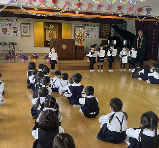 1年間を共に過ごしたお友達とは同じクラスで最後になりますが、4月からは学年が一つ上がり年長・年中となります。そして新たに年少にお友達が加わります。1年間無事に過ごせた感謝とこれからに希望をもって長い春休みになりますが、また元気にお会いしたいと思います。ただ、この修了式で幼稚園とお別れする園児・先生がいますが何処にいても心は繋がっていると信じています。どうぞお元気でいてください。
