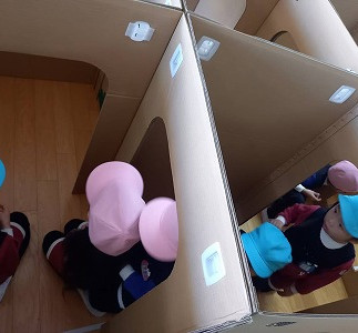 今日は最初に先生のお話を聞いてから、ブラックパネルシアター「ピーターパン」「段ボール迷路」「強いぞ相撲」「マークキャッチ」など色んなゲームで楽しんだ後、最後に歌「思い出のアルバム」をみんなで一緒に歌ってから3階ホールで給食を食べました。
