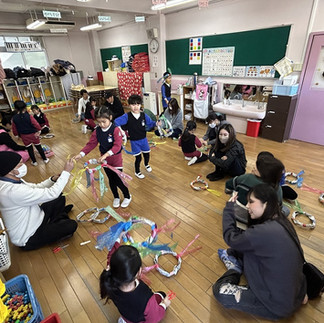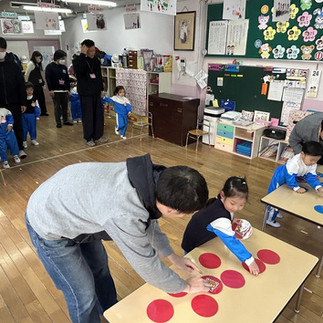 今回は満3歳児のくまちゃん組は節分の製作やゲーム、年少組は動物の絵合わせゲーム、年長組は風船や新聞紙を使ってゲームの玩具を親子で作って最後にゲームをしました。また年中組は合同で3階ホールにおいて体操の先生による指導で縄を使った体操やゲームを行いました。