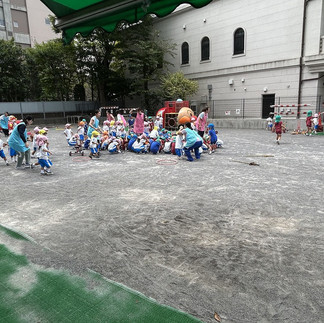 本日は2学期最初の『避難訓練』を行いました。今回の設定は、全園児が園庭で遊んでいる最中に大きな地震が発生、園庭にいる先生が全員を1か所に集めて避難行動を取る、その間に2~3名の先生が園舎内(トイレ含む)に園児が残っていないか確認して園長に報告。暫くすると再度大きな地震が発生、今度は津波警報発令の情報が入ってきたので、全園児が先生方の指示・誘導により3階ホールへの避難するという設定でした。